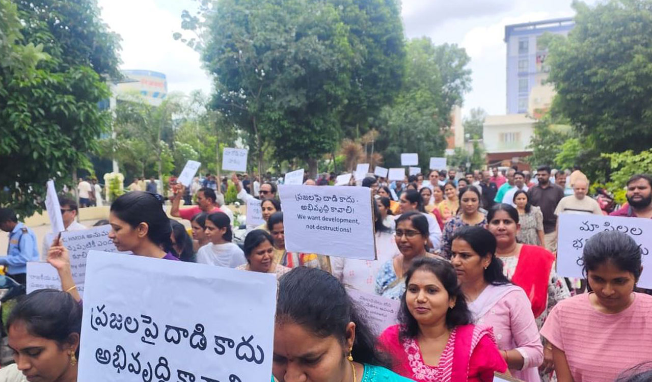 Hyderabad: Over 650 families of the gated community APR Pranav Antilia in Bachupally held a protest on Sunday against the demolition of their boundary wall by the Hyderabad Disaster Management and Asset Protection Agency (Hydraa).