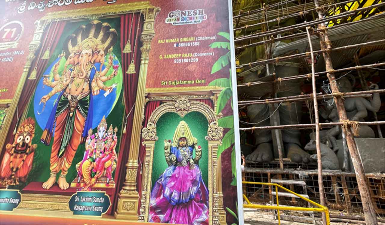 The iconic 69-foot Khairatabad Ganesh idol is taking shape rapidly, with over 60 per cent clay work completed. Crafted by artisans from Tamil Nadu and Odisha, this year’s eco-friendly idol follows the theme “Sri Vishwashanthi Maha Shakthi Ganapathy” for Ganesh Chaturthi on August 27