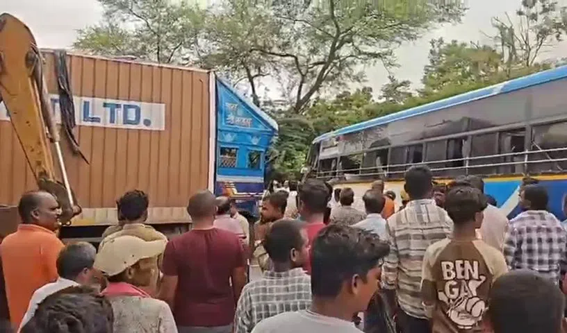 A speeding container truck hit an RTC bus near Mylaram in Warangal district, injuring 26 passengers, several critically. The collision caused a long traffic jam on the Warangal–Khammam route. Victims were rushed to MGM Hospital after first aid