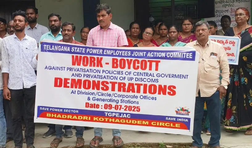 Electricity department employees also boycotted work and staged a protest at the Bhadrachalam division office premises under the banner of TGPE JAC, following a nationwide call by NCCOEEE. JAC district convener DE Jeevan Kumar, speaking at the dharna, demanded the withdrawal of moves to privatise power utilities.