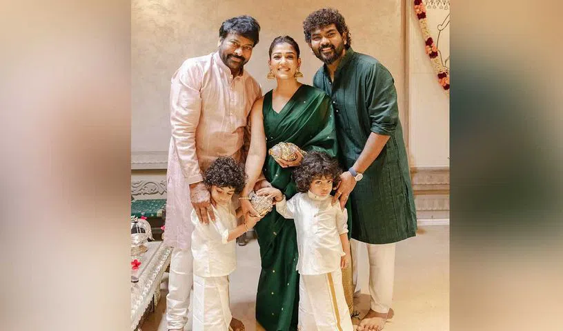 Their twin boys -Uyir Rudronil N. Shivan and Ulag Dhaivag N. Shivan also posed with their parents in matching white kurta pajamas. The photos dropped by Nayanthara on social media also featured Megastar Chiranjeevi who joined the couple during the Diwali celebration.