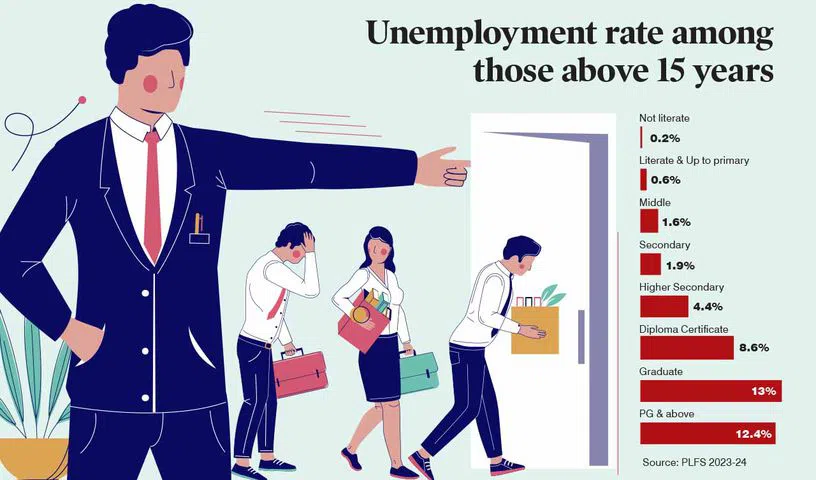One of the concerns raised by the Niti Aayog over the stagnancy in wages/salaries is a lack of adequate skills among the working population. If we observe the unemployment rate among the educated population of the country, we see a unique pattern. As per PLFS 2023-24, the highest unemployment rate (those above 15 years) with the highest level of education is among graduates with 13% (see infographics). This signifies the problem of skill sets among the educated population.