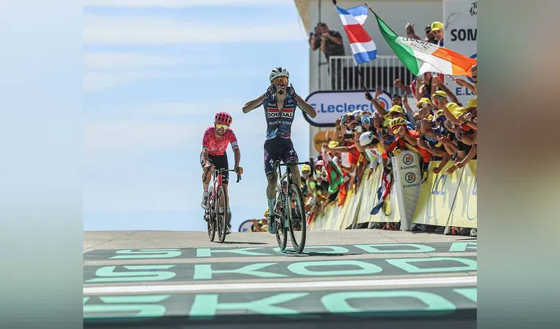 After the sharp final bend, the 24-year-old whippet climber rounded Healy on the steep ramp to the line to take the biggest win of his career in some style. It was his Soudal Quick-Step team’s fourth win on this Tour after Tim Merlier’s two sprint scalps and Remco Evenepoel’s victory in the Stage 5 time trial. It also offered the team a huge boost following Evenepoel’s withdrawal from the race on Saturday.