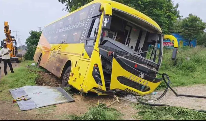 Sangareddy: A private travel bus heading to Hyderabad from Kollapur veered off the road and plunged into a roadside gorge on NH-65 near Sadasivapet on Thursday morning. The driver is suspected to have lost control of the vehicle due to fatigue and lack of sleep.