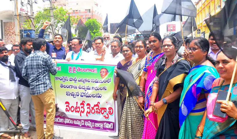 Hundreds of Telangana activists staged a protest in Khammam demanding implementation of Congress’s pre-poll promises, including land, financial aid, pensions, and health cards. The Telangana Udyamakarula Forum warned of backlash in local elections if the sixth guarantee is not fulfilled soon